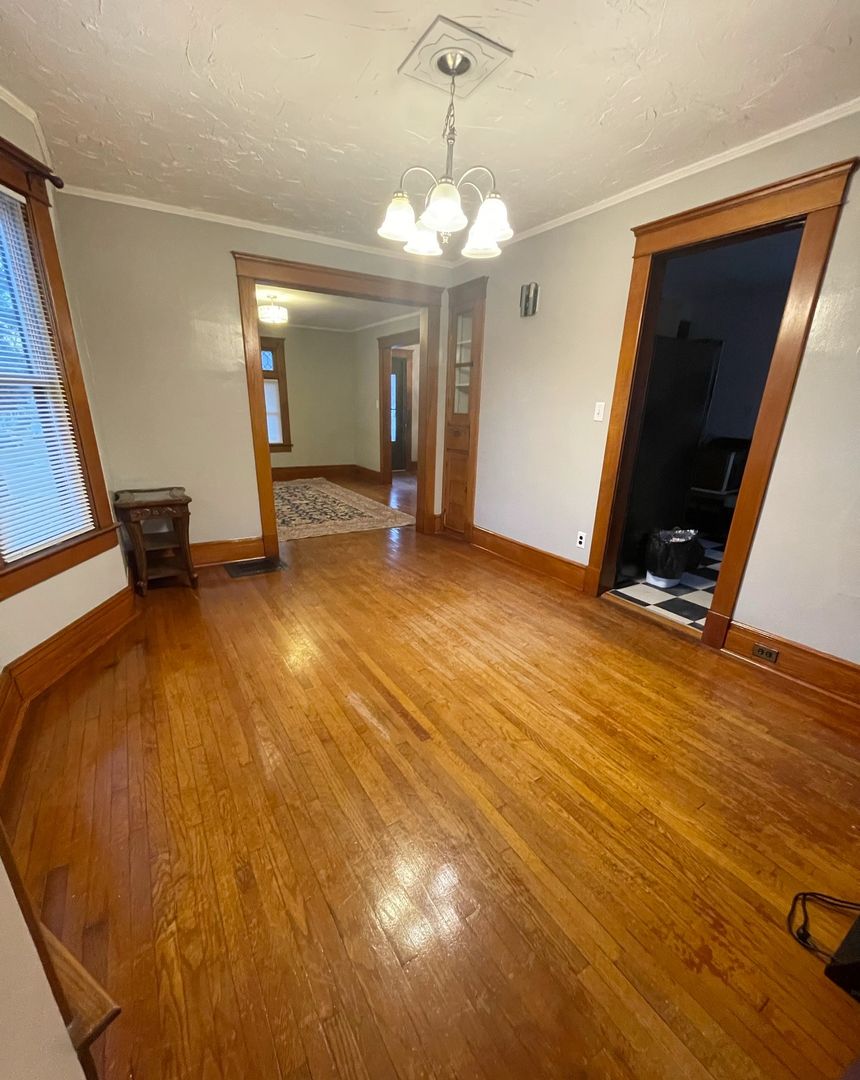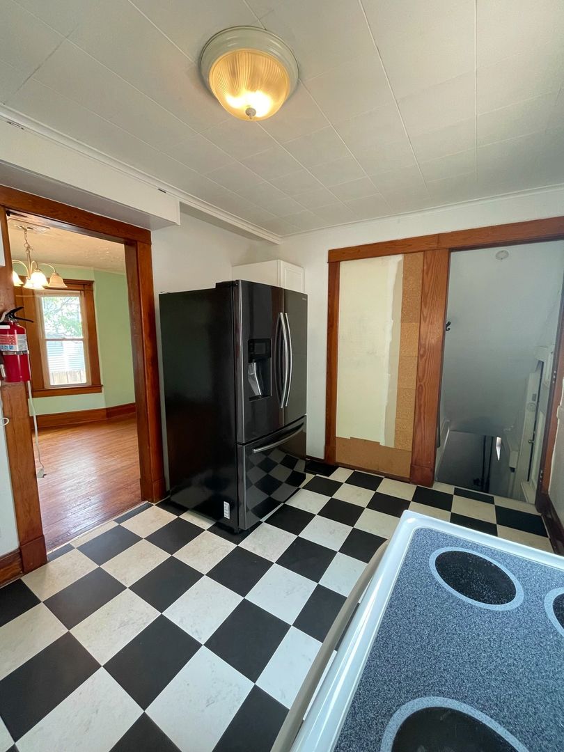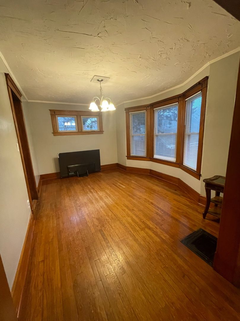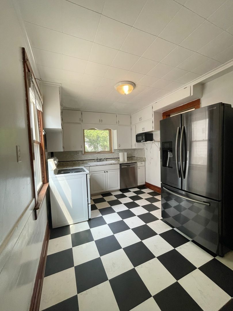 This home features three large bedrooms and 1.5 bathrooms, with wood floors throughout. The kitchen offers plenty of cabinet space and includes a dishwasher, flat-top range, and a large side-by-side refrigerator.