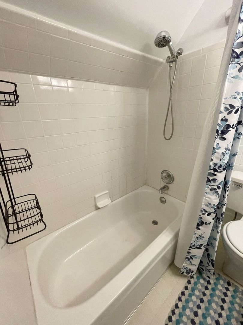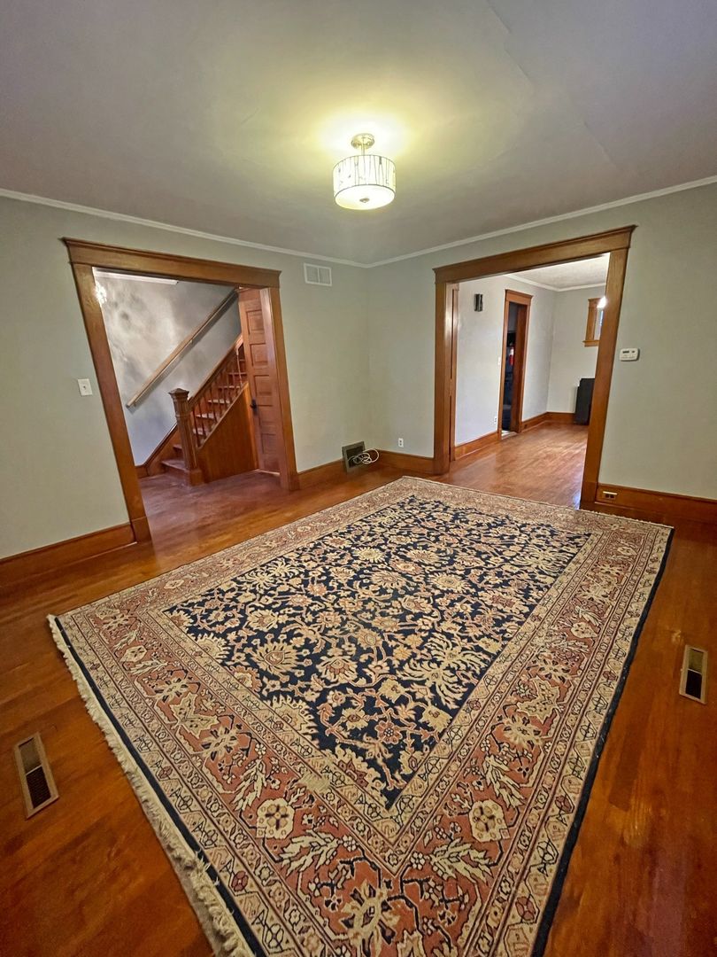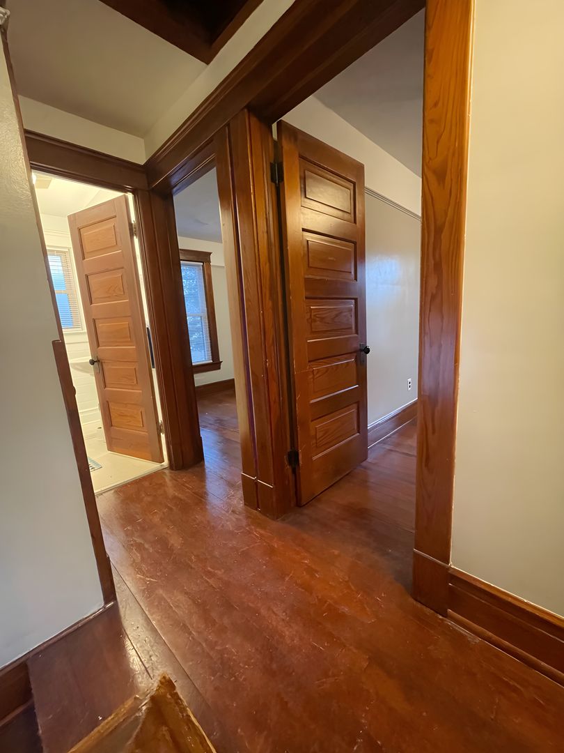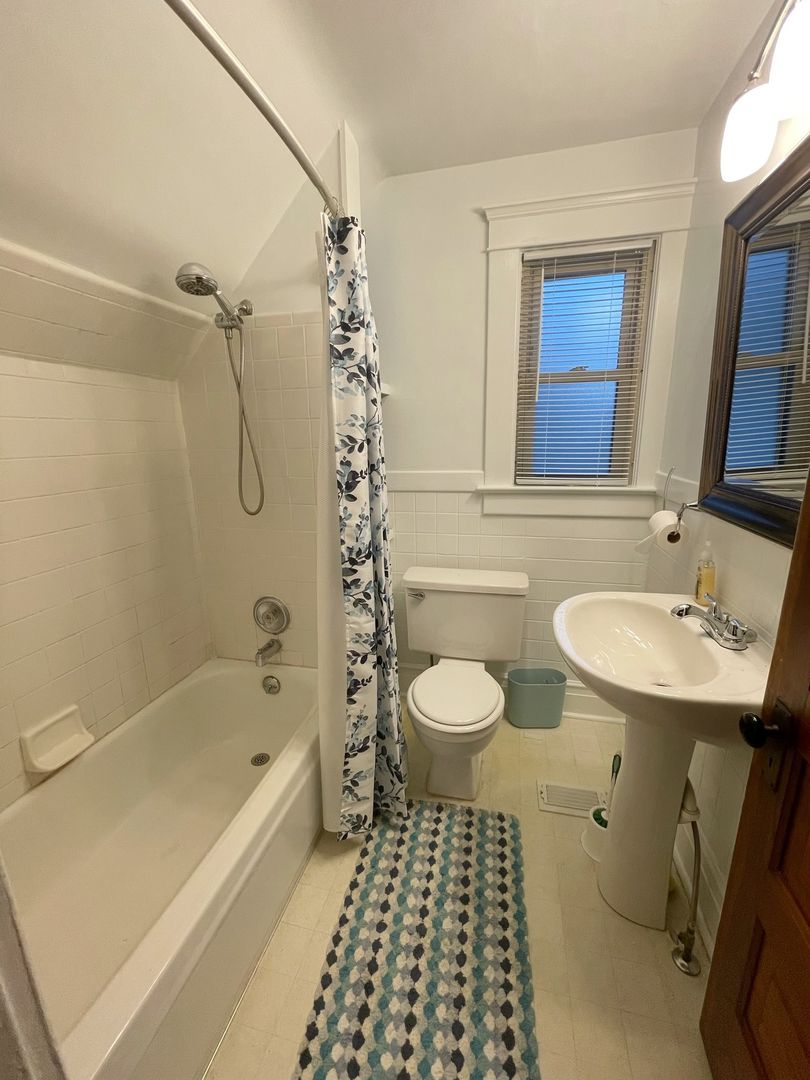 This home features three large bedrooms and 1.5 bathrooms, with wood floors throughout. The kitchen offers plenty of cabinet space and includes a dishwasher, flat-top range, and a large side-by-side refrigerator.