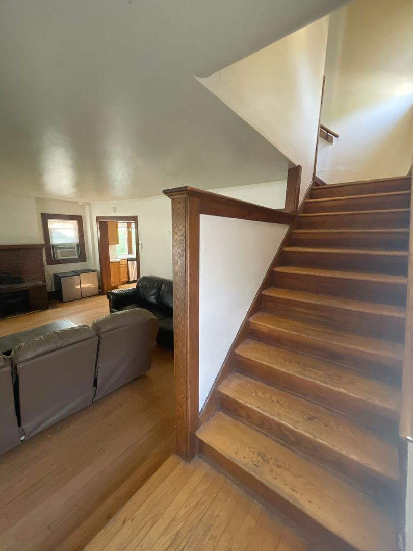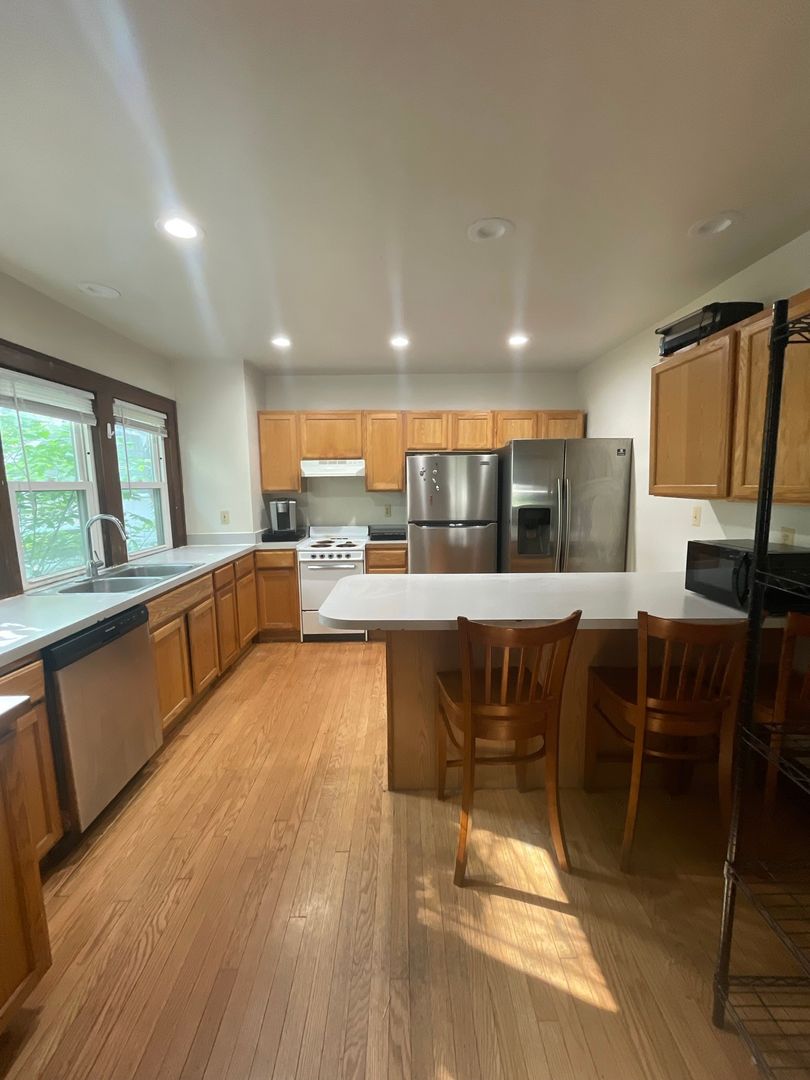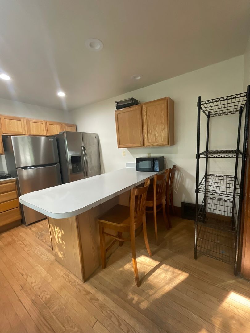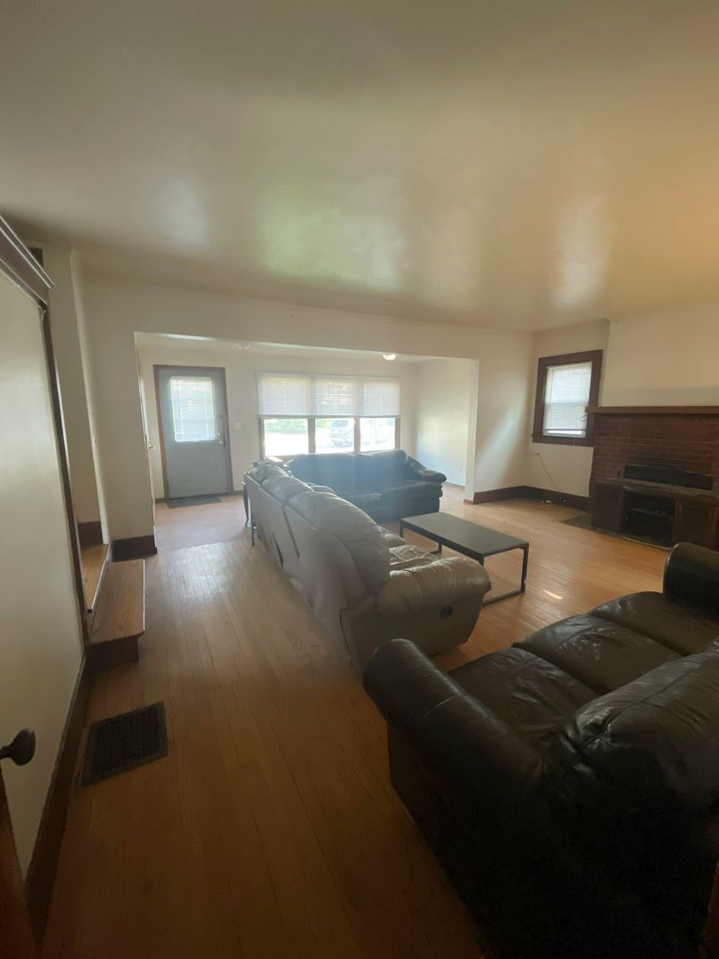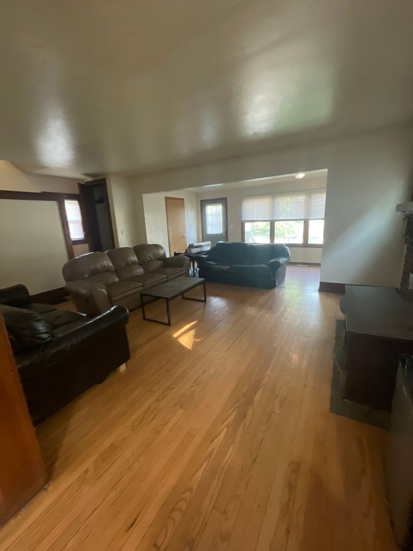 This spacious house features six bedrooms and three bathrooms, with an extra-large living room that opens into a bright kitchen complete with an island counter and two full-size refrigerators. The home has original hardwood floors throughout.