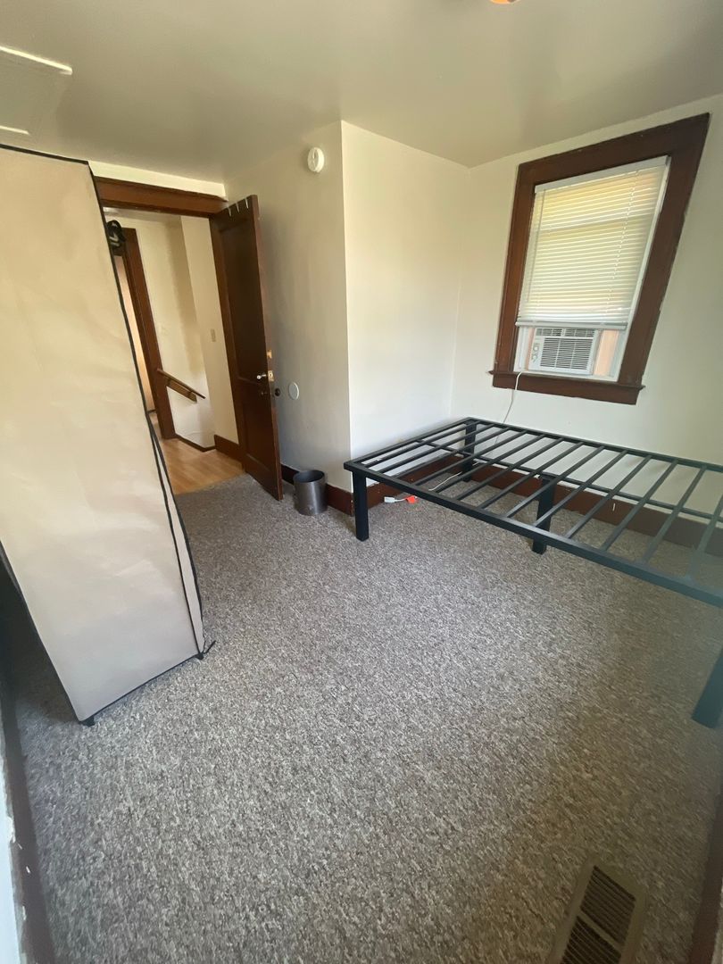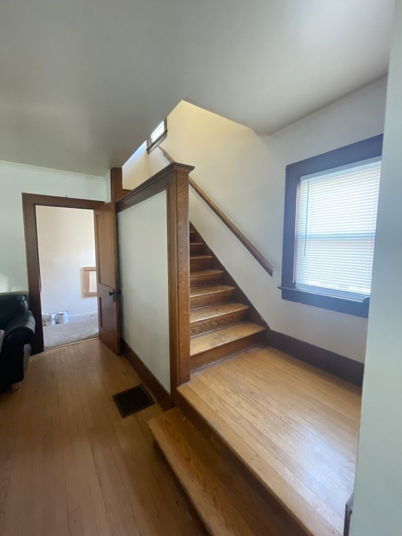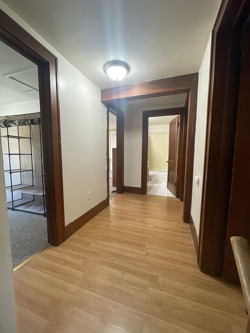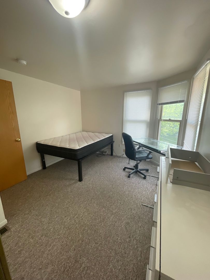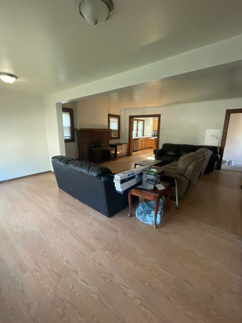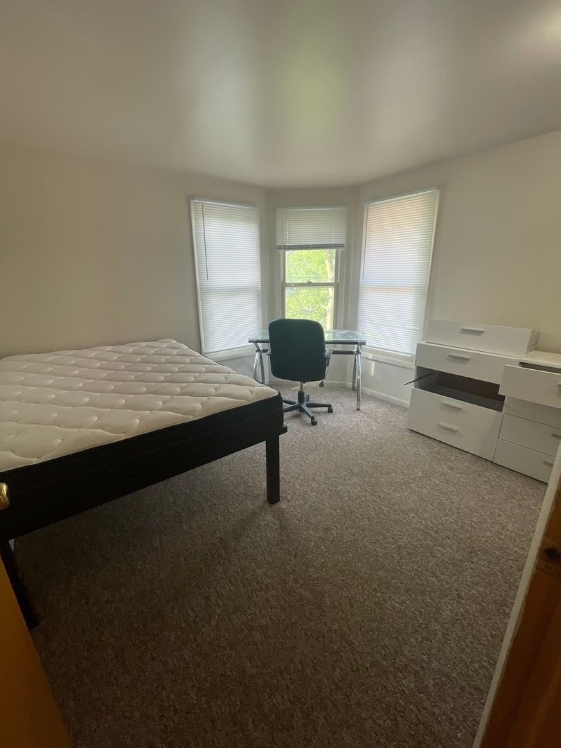 This spacious house features six bedrooms and three bathrooms, with an extra-large living room that opens into a bright kitchen complete with an island counter and two full-size refrigerators. The home has original hardwood floors throughout.